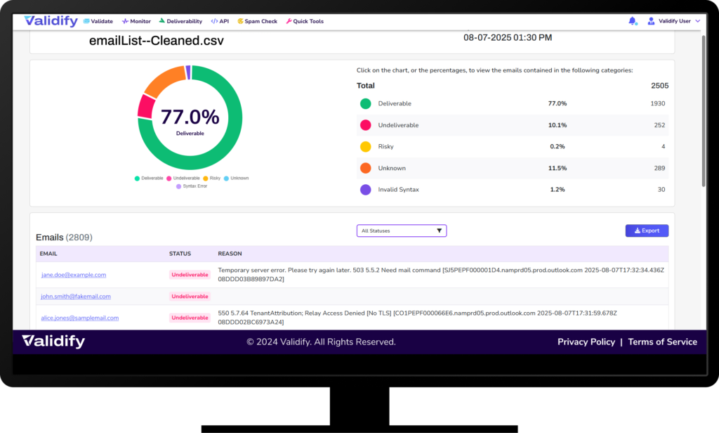 Clean your lists, verify addresses, and reduce bounce rates with the precision and speed of Validify’s next-gen email validation engine.